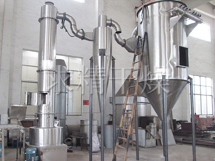 本機組工作過程為料液通過隔膜泵高壓輸入,噴出霧狀液滴,然后同熱空氣并流下降,大部分粉粒由塔底排料口收集,廢氣及其微小粉末經旋風分離器分離,廢氣由抽風機排出,粉末由…